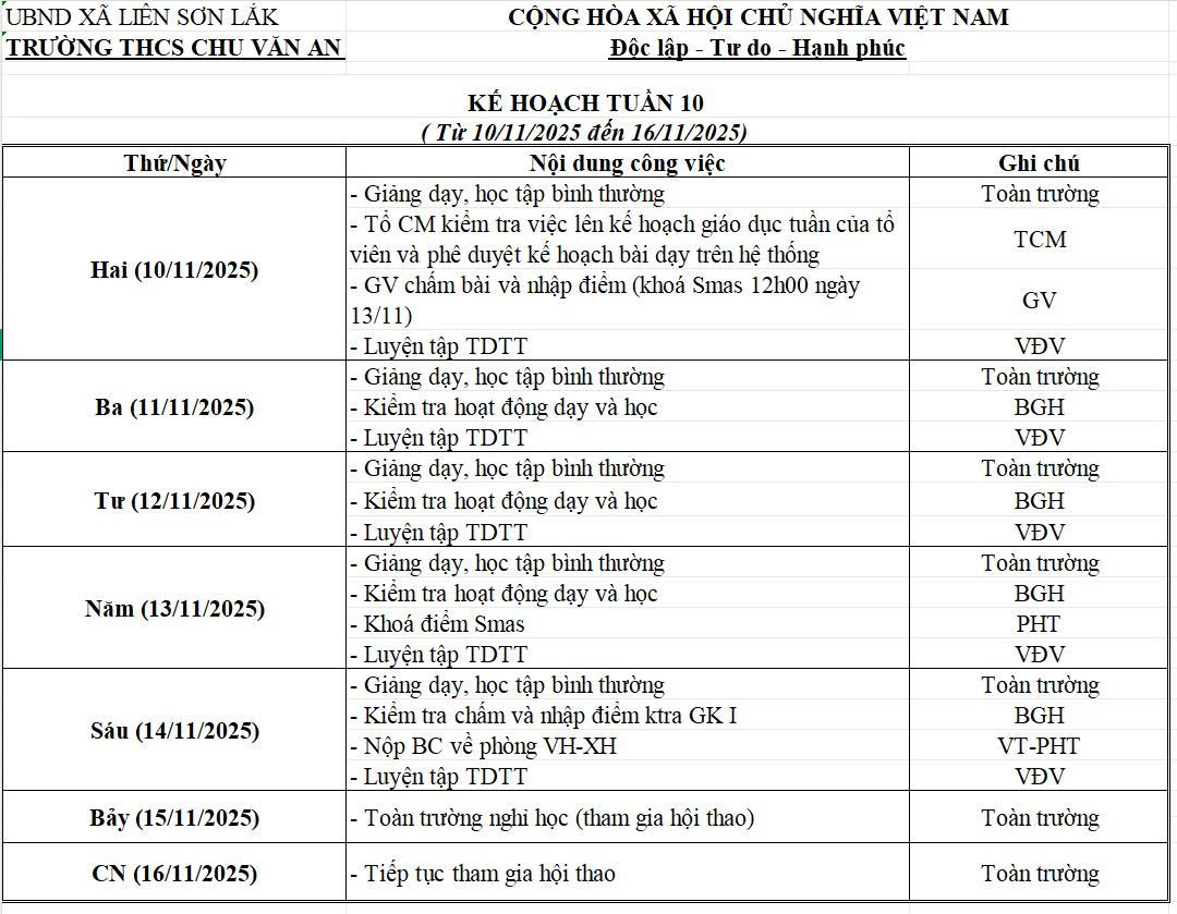 3. KẾ HOẠCH CHUYÊN MÔN TUẦN 10(Từ ngày 10/11/2025- 16/11/2025)