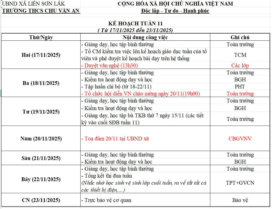 KẾ HOẠCH CHUYÊN MÔN TUẦN 11(Từ ngày 17/11/2025- 23/11/2025)