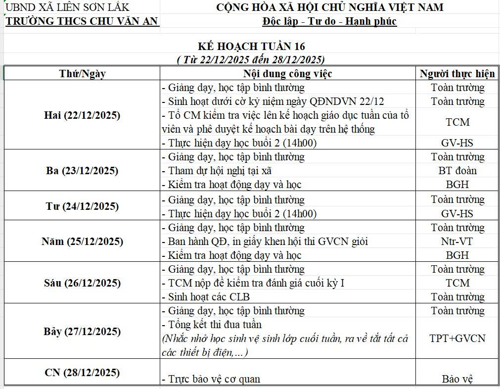 KẾ HOẠCH CHUYÊN MÔN TUẦN 16(Từ ngày 22/12/2025- 28/18/2025)