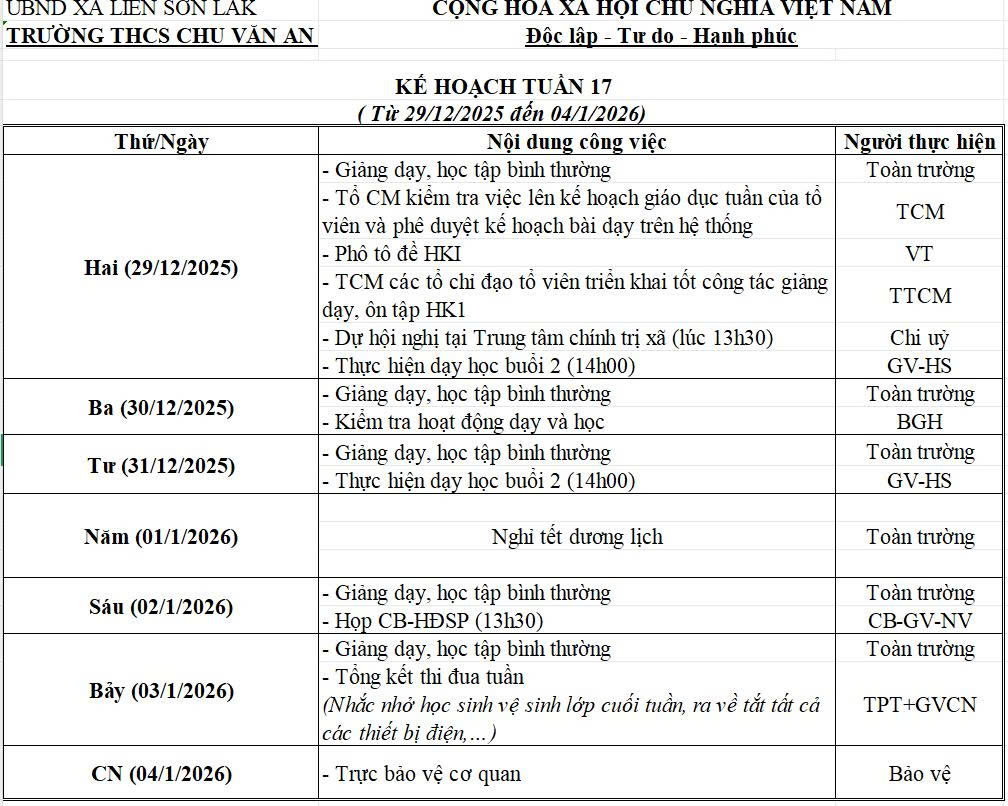 KẾ HOẠCH CHUYÊN MÔN TUẦN 17(Từ ngày 29/12/2025- 04/01/2026)