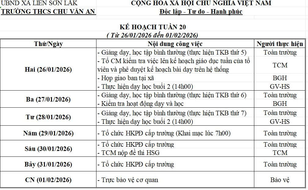 KẾ HOẠCH CHUYÊN MÔN TUẦN 20(Từ ngày 26/01/2026- 01/02/2026)