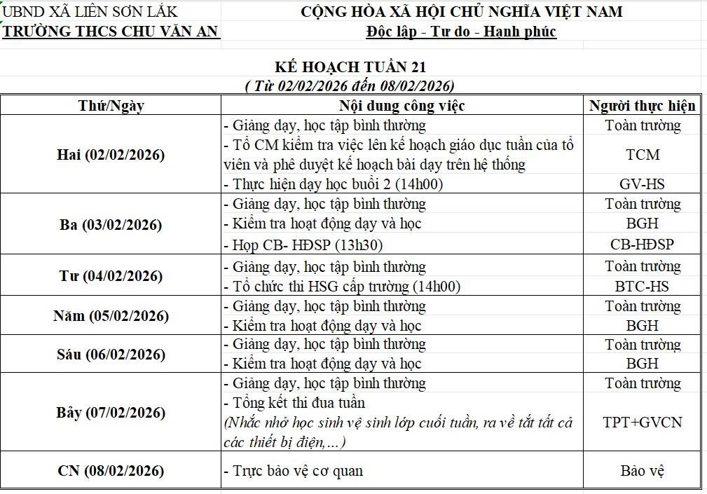3. KẾ HOẠCH CHUYÊN MÔN TUẦN 21(Từ ngày 02/02/2026- 08/02/2026)