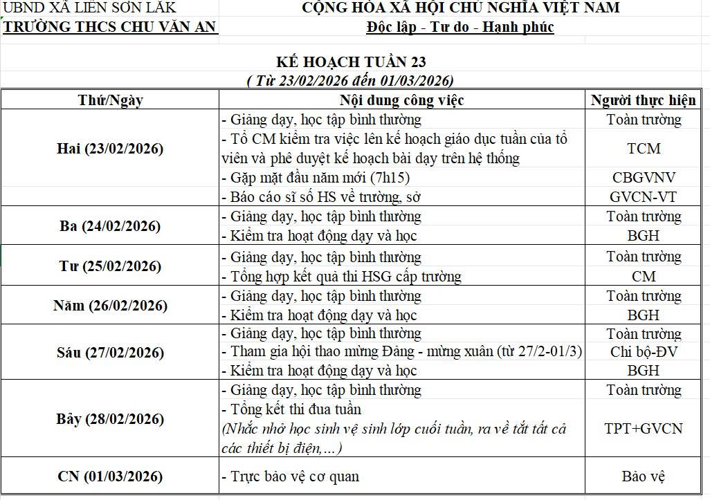 • KẾ HOẠCH CHUYÊN MÔN TUẦN 23(Từ ngày 23/02/2026- 01/03/2026)